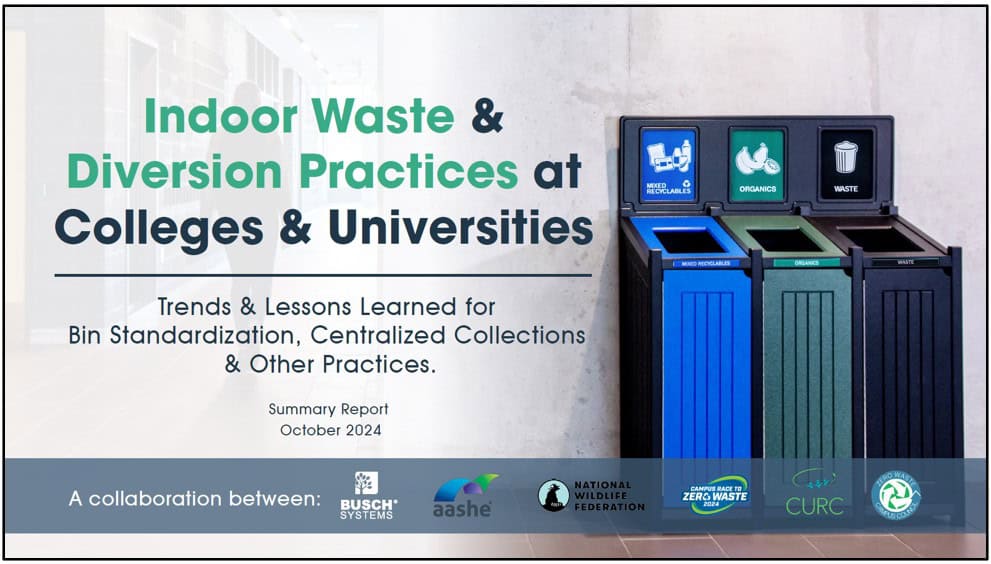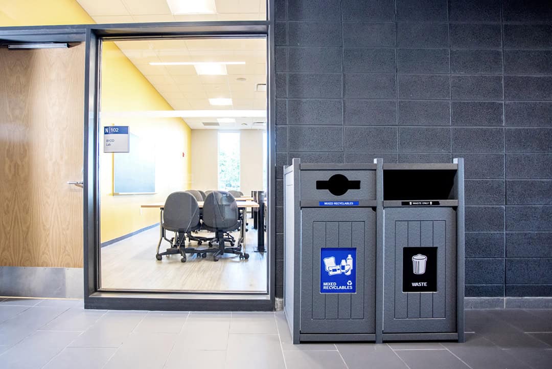 In part one of this blog, I described the growing trend towards “all-in-the-hall” collection arrangements that involves removing waste baskets from classrooms and meeting rooms in academic and workplace settings. These arrangements, which rely on people to carry their personal waste out to larger bins (typically 20 to 45 gallons) in hallways and other common areas, have been shown to increase waste diversion and lower recycling contamination. A 2024 survey of US and Canadian sustainability managers conducted by Busch Systems and several partners (Indoor Waste & Diversion Practices at Colleges & Universities) supported this point and shared strong evidence that this system saves money and frees custodial time to focus on more important cleaning tasks. However, if consolidating waste collections to common areas is a slam dunk operationally, the survey results also showed that careful planning is important to successfully implementing it.