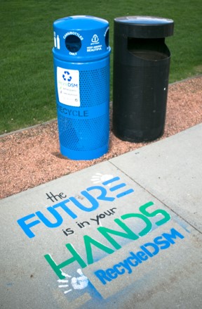 The ultimate key to reducing recycling contamination is raising awareness to address confusion. As anyone involved with public space programs knows, however, it’s no easy way to engage people passing through public spaces. All three communities look for opportunities where they exist. In addition to being a large source of beverages containers, both BREC and Austin prioritized sports fields because of the opportunity to target recycling information to participants via the sports leagues. Operation Downtown’s (Des Moines) outreach efforts include visits to neighborhood to-go eating establishments and food trucks, asking them to post flyers for customers to see. Operation Downtown and BREC both use the areas in and around the bins to raise awareness when first introducing recycling bins to a new location. BREC puts out lawn signs with program information or humorous messages, while Operation Downtown has done elaborate chalk art murals to draw attention. Operation Downtown has gone the additional step of holding a PR event to draw media attention to the recycling program.