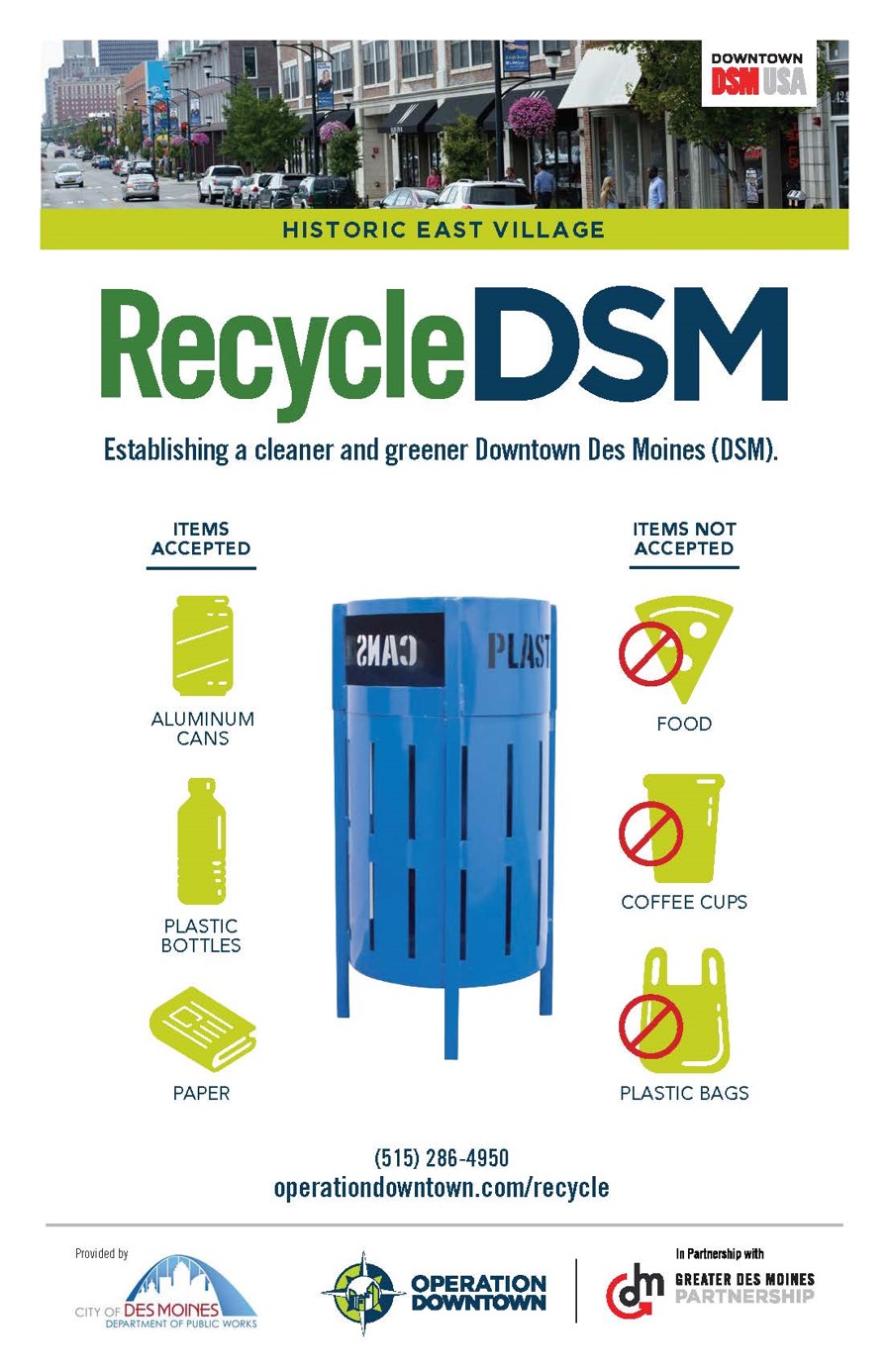 While BREC and Austin’s recycling efforts cover a range of different urban and suburban park and recreation settings, Operation Downtown’s waste reduction program, as the name implies, focuses squarely on the streetscape, urban squares and public spaces in downtown Des Moines. Chartered as a 501(c)6 business improvement district (BID), Operation Downtown launched their Recycle DSM initiative as a pilot with eight bins in the city’s Historic East Village neighborhood in 2016. Their executive director Amy Lego, participated on an April 2021 Busch System’s webinar, where she detailed the subsequent expansion to approximately 70 locations and a strategy to continue adding roughly 10 new bins a year in the downtown area.